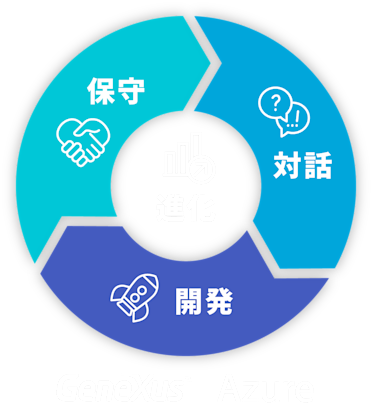 お客様との対話によるアイデア創出から、高速開発ツール GeneXus・クラウド環境 Microsoft Azure を組み合わせ、 ビジネスの変化を加速し進化させるITシステムを構築します。
